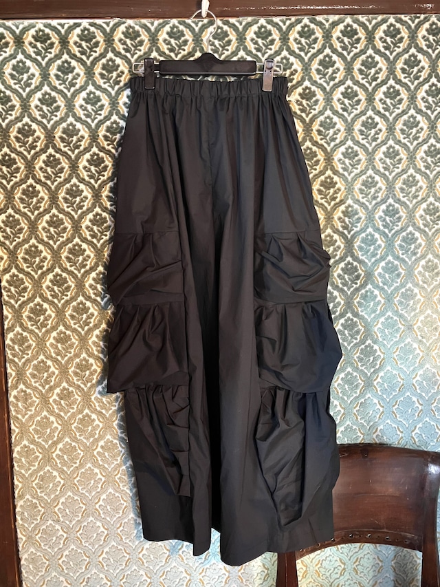 ・リボン柄のウールと柔らかいブラックデニムを合体 ・その日の気分でどちらを前にしてもオーケー ・両脇ポッケ付き ・裾切りっぱなし ・毛 綿 ・ウエストゴム 63cm 総丈 95cm