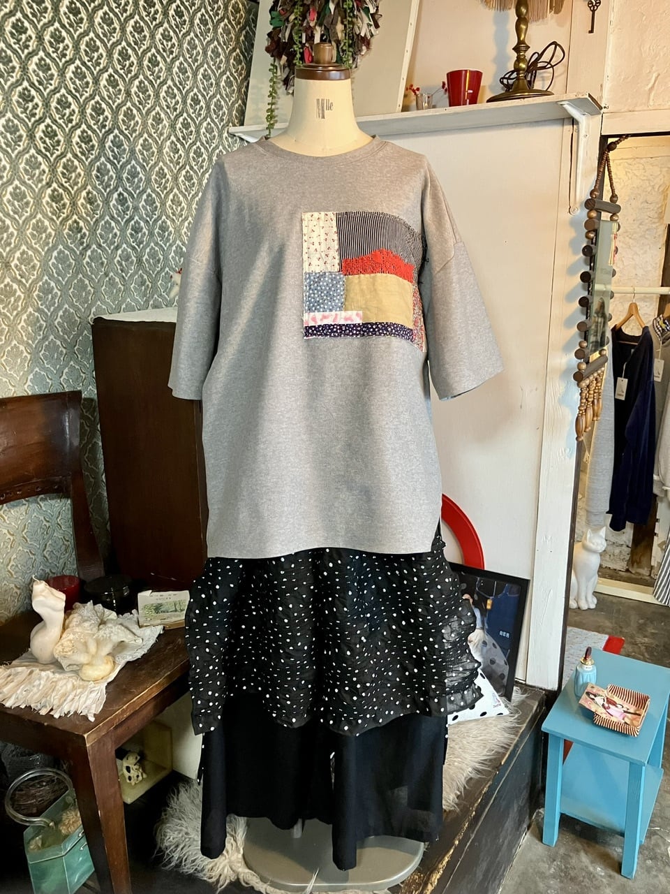 涼しいのですが、透けを防ぐためにシャーリングの効いた水玉生地をエプロン風に合体